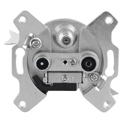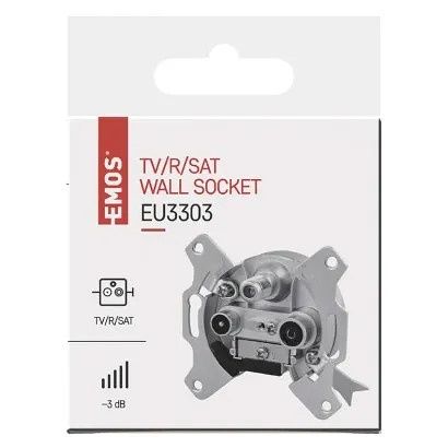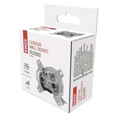 Účastnická zásuvka EU 3303 satelitní koncová s útlumem 3 dB a zdířkami pro TV + Rádio + SAT. Účastnická zásuvka propojuje např. anténu s televizí, satelitem nebo set-top-boxem. SAT zdířka průchozí pro stejnosměrné napětí a lze ji také využít pro průchod napájení předzesilovače v terestrické anténě.