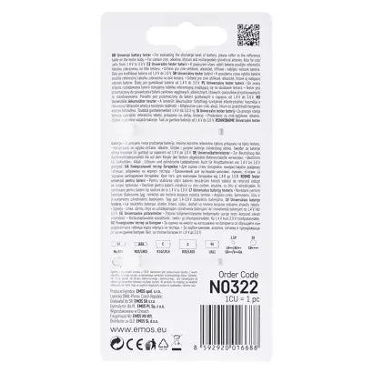 Tester baterií určený k indikaci stupně nabití (vyčerpání) baterie. Umožňuje měřit baterie velikostí N, AAA, AA, C, D, 9 V a knoflíkové baterie.