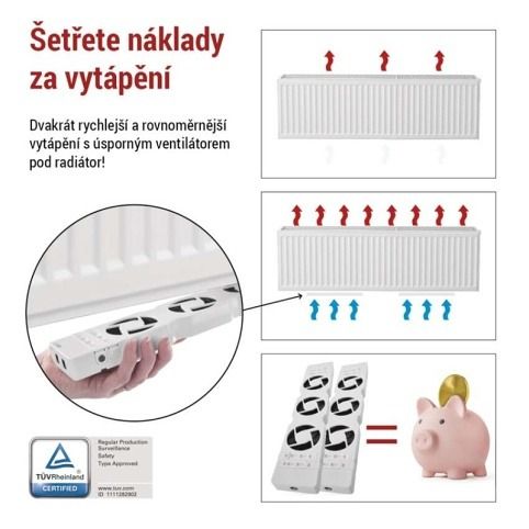Ventilátor pod radiátor pro zvýšení účinnosti vytápění.Výhody produktuZvýšení vytápění domácnosti - umožňuje snížit teplotu topného systému.Úspora nákladů na energii.Velmi nízká spotřeba energie.Komfort díky rychlému vyhřátí domácnosti.Snadná instalace a montáž na většinu ocelových teplovodních radiátorů a konvektorů.