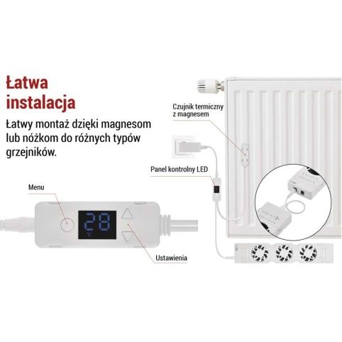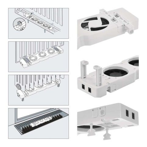 Ventilátor pod radiátor pro zvýšení účinnosti vytápění.Výhody produktuZvýšení vytápění domácnosti - umožňuje snížit teplotu topného systému.Úspora nákladů na energii.Velmi nízká spotřeba energie.Komfort díky rychlému vyhřátí domácnosti.Snadná instalace a montáž na většinu ocelových teplovodních radiátorů a konvektorů.