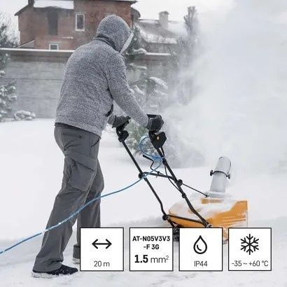 Mrazuvzdorný kabel s plastovou izolací - pro střední namáhání, v prostředí obyčejném, studeném i vlhkém (odolný proti ztíženým klimatickým podmínkám a teplotám až do -35°C). Je odolný vůči oleji a UV záření. Krytí IP44 umožňuje použití ve venkovním prostředí.