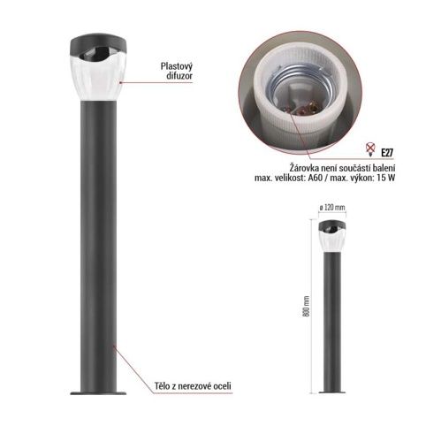 EMOS Zahradní sloupkové svítidlo ARTEO, 12 x 12 x 80 cm, 1 x E27, 15 W