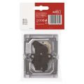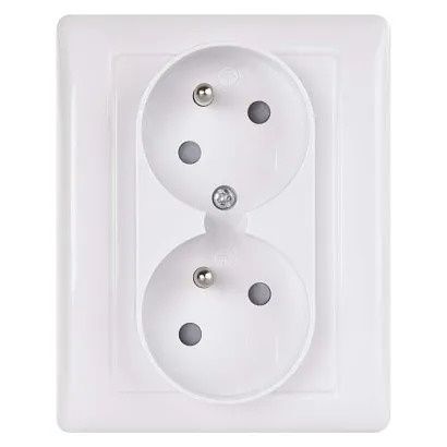 Kvalitní dvojnásobná FRENCH zásuvka s integrovanými dětskými clonkami. Montáž do krabice. IP20. Šroubové svorky. Dvě pootočené zásuvkové dutiny.