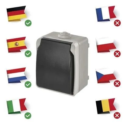 Produkty SCHUKO nejsou určeny pro použití v ČR, PL a SK. Jsou určeny pro použití v zemích se systémem SCHUKO.Kvalitní nástěnná voděodolná SCHUKO zásuvka s ochraným víčkem.