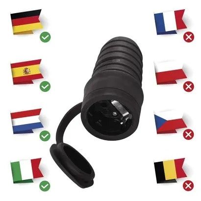 Produkty SCHUKO nejsou určeny pro použití v ČR, PL a SK. Jsou určeny pro použití v zemích se systémem SCHUKO.Gumová zásuvka SCHUKO pro pohyblivý prodlužovací přívod. Je vhodná k připojení elektrických zařízení i v exteriéru.