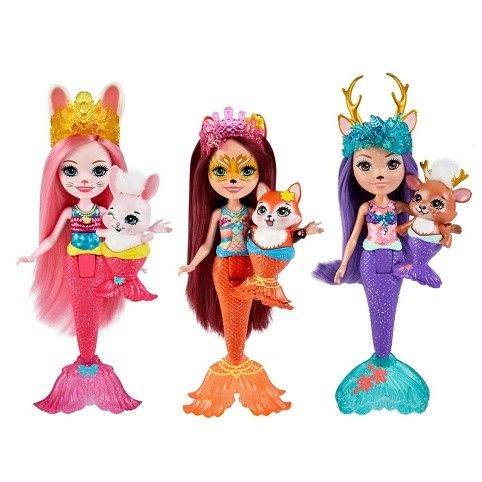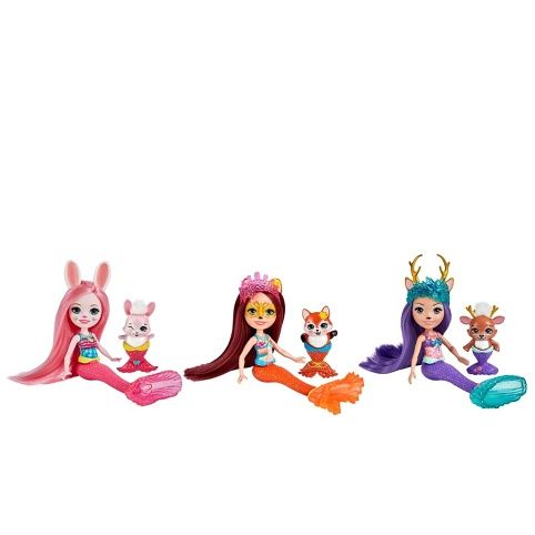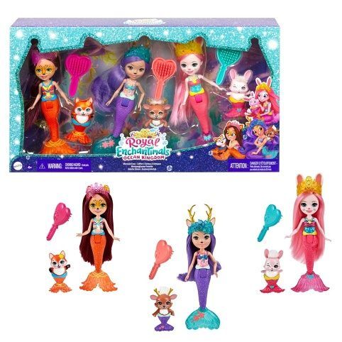 Udělejte si radost s tímto balíčkem 3ks Enchantimals™ Mořská panna! Tato jedinečná kolekce obsahuje oblíbené bytůstky Enchantimals™ jako mořské panny. Bree Zajíčková™, Felicity Lišková™, Danessa Jelínková™ a jejich mazlíčci mají třpytivé ocasy mořských panen (které se ohýbají v pase), korunky a krásné dlouhé vlasy. Ke každé panence patří také kartáč.
