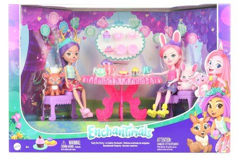 Tento 19dílný herní set Enchantimals™ Čajový dýchánek obsahuje 2 panenky, 2 nejlepší kamarádky, stůl, 2 lavice a doplňky, jako je konvička, šálky, zákusky a další. Panenky Danessa Jelínková™a Bree Zajíčková™ jsou oblečeny do rozkošných oblečků s doplňky. Věk 4+