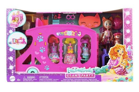 Seznamte se s Enchantimals™, skupinou roztomilých dívek, které mají zvláštní pouto se svými nejlepšími zvířecími kamarády. Když se tento herní set, Kočičí módní obchod na kolech, otevře a odhalí módní šatník se vším, co dítě potřebuje k uspořádání módní přehlídky, všichni vědí, že je čas začít Glam Party™! Růžový pojízdný obchůdek s roztomilými kočičími oušky ukrývá věšáky s ramínky na oblečky, módní a tematické doplňky, figuríny a převlékací kabinku pro panenku i jejího mazlíčka. Malý fialový vozík se dá odpojit a nabídne posezení a zkrášlovací toaletní stolek pro malého zvířecího kamaráda. V herním setu je panenka kočička a její věrný zvířecí kamarád - jsou vždy spolu a navíc vypadají stejně! Barvy a vzhled výrobku se mohou lišit. Věk 4+