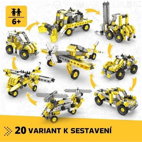 Stavebnice Engino Creative Builder 20 modelů je určena dětem od 6 let a nabízí široké možnosti tvoření díky 20 různým variantám modelů, které lze sestavit z jedné sady. Sada obsahuje dílky v kombinaci žluté, šedé, černé a bílé barvy, které umožňují sestavit různé stroje a vozidla, jako jsou auta, letadla, vrtulníky či vysokozdvižný vozík. Díky variabilnímu systému lze modely snadno přestavovat a rozvíjet tak manuální zručnost a kreativitu dětí. Součástí stavebnice je nejen tištěný návod, ale také interaktivní mobilní aplikace Engino kidCAD®, která nabízí 3D modely jednotlivých variant. Tyto modely si děti mohou libovolně otáčet, prohlížet a upravovat, což výrazně usnadňuje sestavení a podporuje zájem o technické a konstruktérské dovednosti. Stavebnice je kompatibilní s ostatními výrobky značky Engino, takže ji lze rozšiřovat a kombinovat. Kvalitní plastové dílky jsou pevné a zároveň bezpečné pro děti, což potvrzují i certifikace uvedené na obalu. Balení stavebnice je barevné a přehledné, s výraznou grafikou zobrazující hotové modely, což usnadňuje výběr a inspiruje k dalším hrám. Výrobek je vyroben na Kypru a je určen pro rozvoj logického myšlení, představivosti i schopnosti řešit technické úkoly. Celkově jde o edukativní hračku, která kombinuje zábavu s učením a rozvíjí praktické dovednosti.
