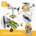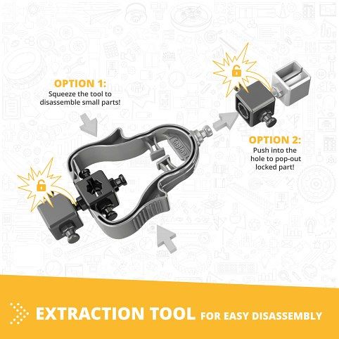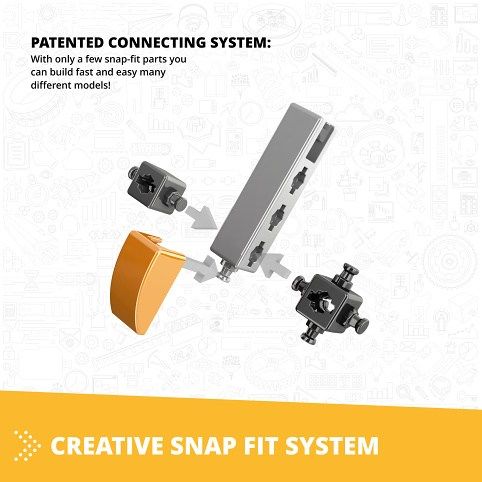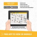 možnost sestavit 4 modely, stavebnice umožňuje: 1. level sestavení modelu, 2. level vymalování papírových dílů, 3. level experimentování, 4. level učení se, aplikace Engino kidCAD zobrazující 3D model
