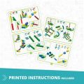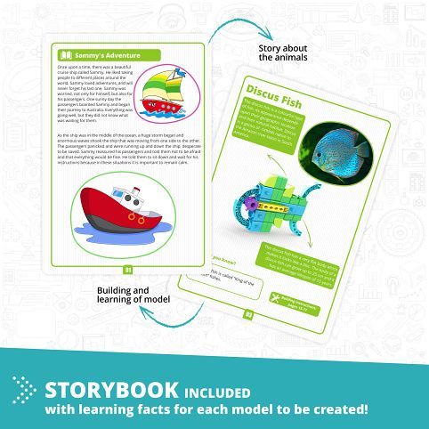 možnost sestavit 5 modelů, zajímavá fakta o zvířátkách, omalovánky, spojování teček a obkreslování čísel a písmen abecedy, aktivity k procvičování matematiky, tvarů a barev, aplikace Augmented Reality