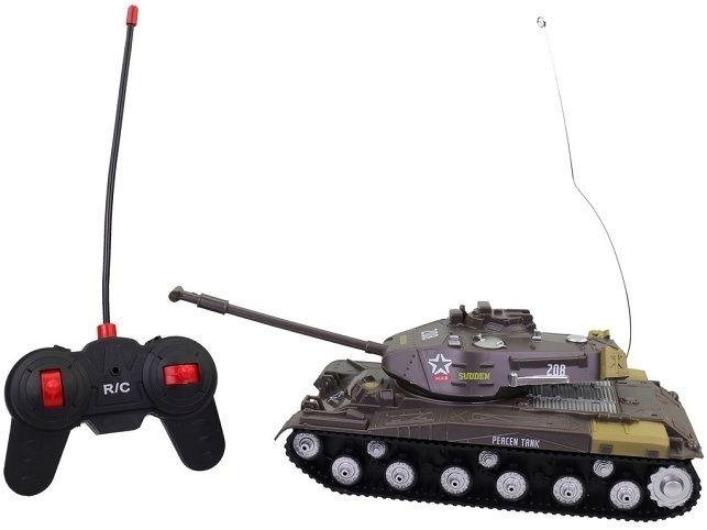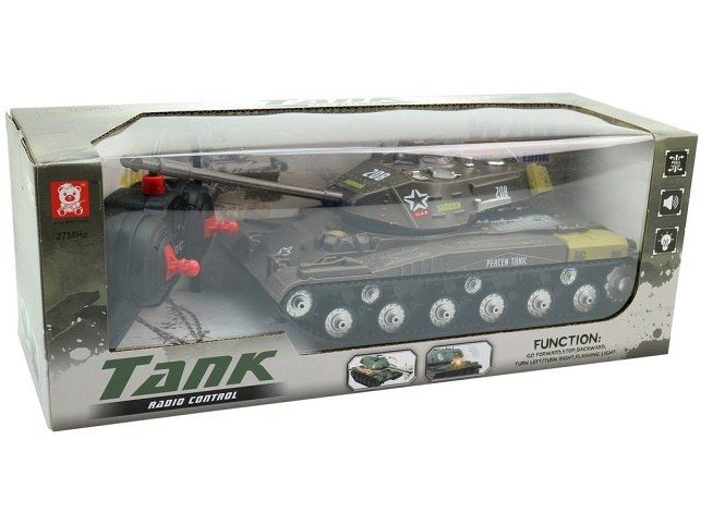 Tank vojenský na dálkové ovládání, světlo, zvuk, 11,5 x 29,5 cm potěší všechny malé nadšence do bitev. Snadné ovládání může vést k víře na bitevním poli. Můžete otáčet věží s hlavní o 360° a pohybovat s ní nahoru a dolů. Ke zprovoznění produktu je potřeba celkem 6 AA baterií, které nejsou součástí balení. Materiál: plast. Rozměr produktu: 29,5 x 11,5 cm. Rozměr balení: 33 x 12,5 x 12,5 cmVhodné pro děti od 3 let.