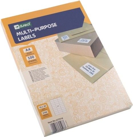 Ideální pro všechny laserové a inkoustové tiskárny, kopírky, barevné laserové tiskárny a barevné kopírky. Šetrné k životnímu prostředí a s certifikátem FSC. Štítky jsou 100% recyklovatelné pomocí odpadního papíru, recyklovatelný kartonový obal. barva: bílá rozměr etikety: 70 x 30 mm počet etiket na A4: 27 kusů počet etiket v balení: 2700 kusů