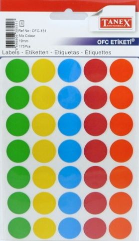 Barva: barevný mix rozměr etikety: průměr 19 mm aršíků v sáčku: 5 kusů etiket v sáčku: 175 kusů