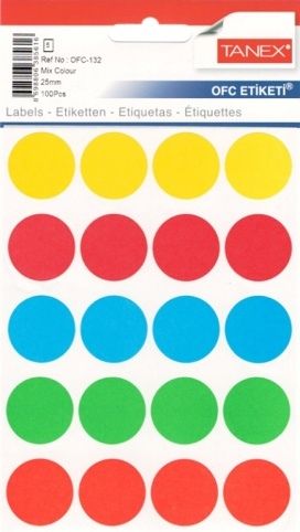 Barva: barevný mix rozměr etikety: průměr 25 mm aršíků v sáčku: 5 kusů etiket v sáčku: 100 kusů