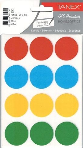 Barva: barevný mix rozměr etikety: průměr 32 mm aršíků v sáčku: 5 kusů etiket v sáčku: 60 kusů
