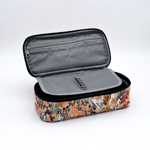 Etue s jednou chlopní v atraktivním kvetinovým designu. Praktická kapsa uzavíratelná na zip obsahuje 2 menší otevrené kapsicky, 1 samostatne uzavíratelnou kapsicku a 5 smycek na psací potreby. Objemný odkládací prostor pro další školní nezbytnosti. Etue o velikosti 22x10,7x7 cm.