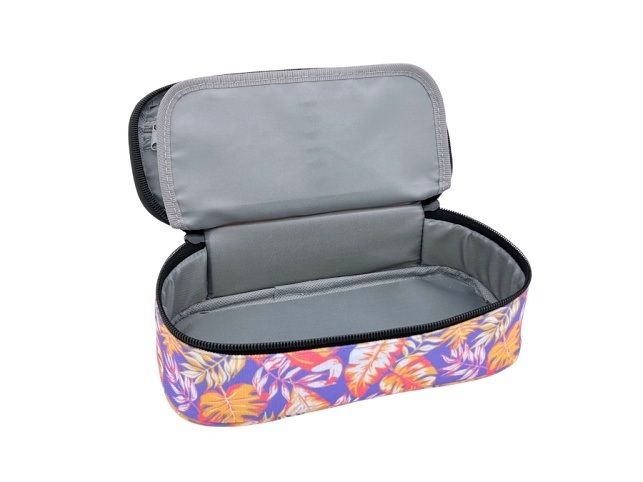 Etue s jednou chlopní ve světle fialové barvě. Praktická kapsa uzavíratelná na zip obsahuje 2 menší otevřené kapsičky, 1 samostatně uzavíratelnou kapsičku a 5 smyček na psací potřeby. Objemný odkládací prostor pro další školní nezbytnosti. Etue o velikosti 22x10,7x7 cm.