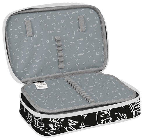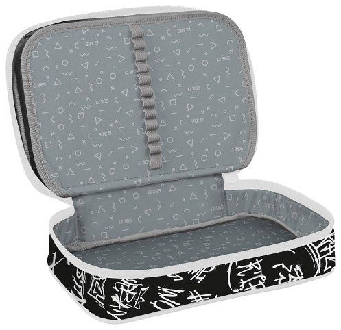 Pouzdro se uzavírá na zip s praktickým látkovým poutkem, které usnadňuje otevírání i manipulaci. Vnitřní prostor je rozdělen do dvou pater a vybaven množstvím gumiček v různých velikostech, díky nimž má každá pomůcka své místo.