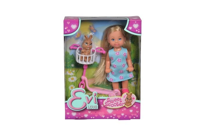 Panenka Evička na koloběžce se třemi kolečkami a s roztomilým králíčkém, kterého veze v košíku. Velikost panenky 12 cm.