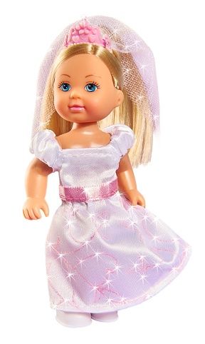 Panenka Evička jako nevěsta ve svatebních šatech, s tiárou se závojem a svatební kyticí. Velikost panenky 12 cm.