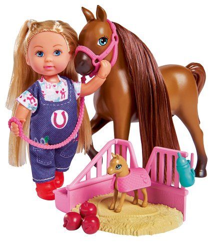 Panenka Evička Veterinářka pomáhá na svět hříbátku. S klisnou, hříbátkem, pelíškem pro hříbátko a příslušenstvím. Velikost panenky 12 cm.