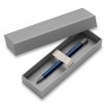 Kuličkové pero Faber-Castell Hexo Blue má šestihranné tělo z eloxovaného hliníku s kovovým klipem.