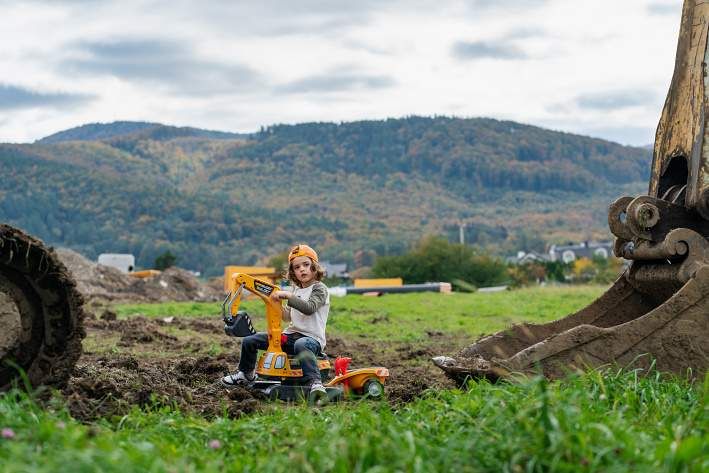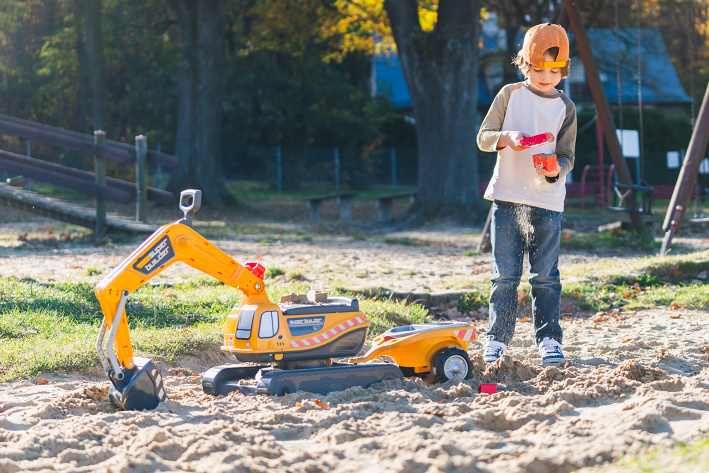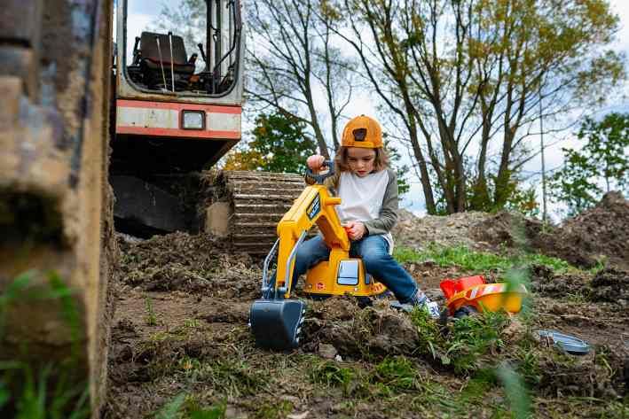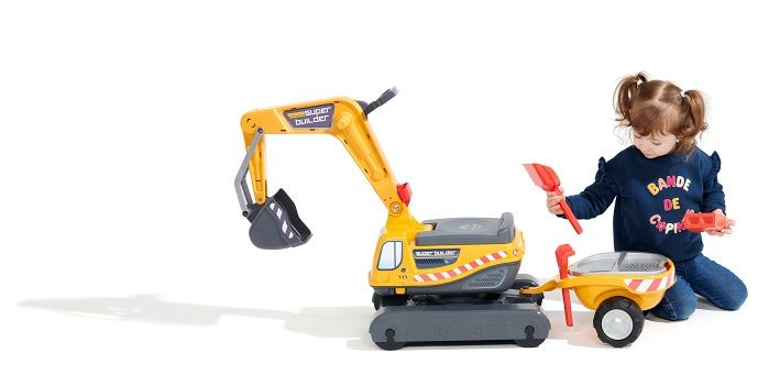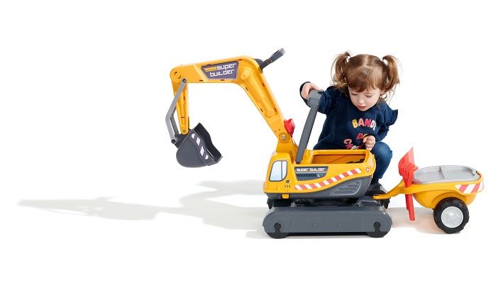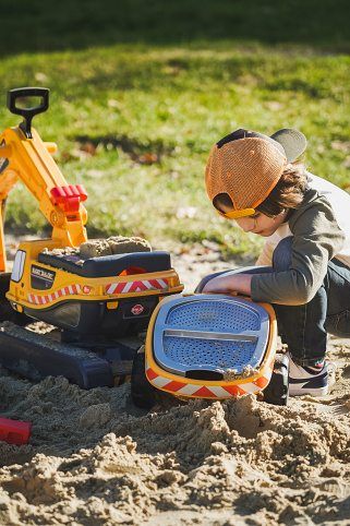 odrážedlo, funkční rypadlo, přívěs, otevírací sedadlo, cihličky, hraběčky, lopatka, sítko