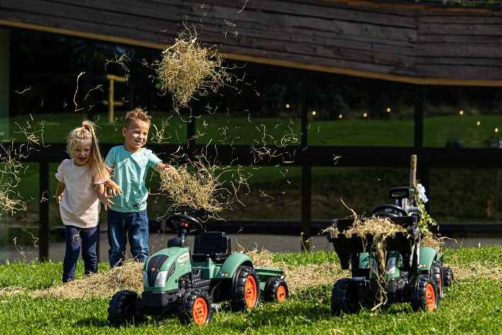 kloubový bagr, přední lopata, přívěs, pro děti od 2 do 5 let, rozměry 171x42x60cm, hmotnost 9,5kg