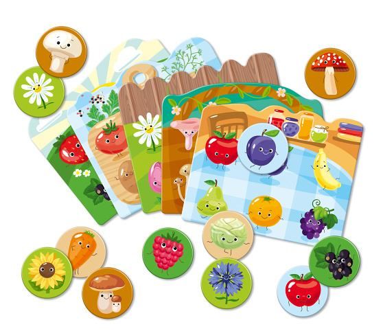 Far Far Land Lotto kartičky příroda. Balení obsahuje 30 žetonů a 5 hracích polí s motivy přírodních plodin a rostlin.