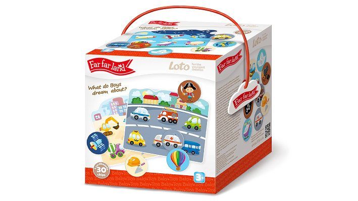 Far Far Land Lotto kartičky dobrodružství. Balení obsahuje 30 žetonů a 5 hracích polí s motivy pro kluky.