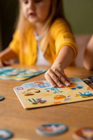 Far Far Land Lotto kartičky dobrodružství. Balení obsahuje 30 žetonů a 5 hracích polí s motivy pro kluky.