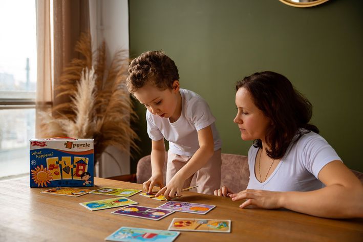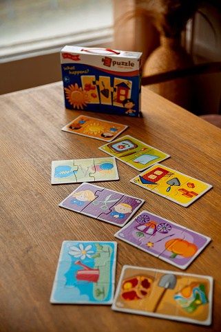 Far Far Land Puzzle činnosti trojice. Balení obsahuje 8 puzzle obrázků, které se skládají ze 3 dílků (vyobrazují trojice k sobě patřících předmětů).