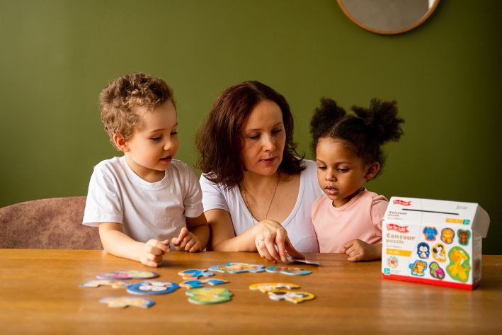 Puzzle obrysové pro děti, motiv divoká zvířátka. Balení obsahuje 8 obrázků. Každý puzzle obrázek se skládá ze dvou částí.
