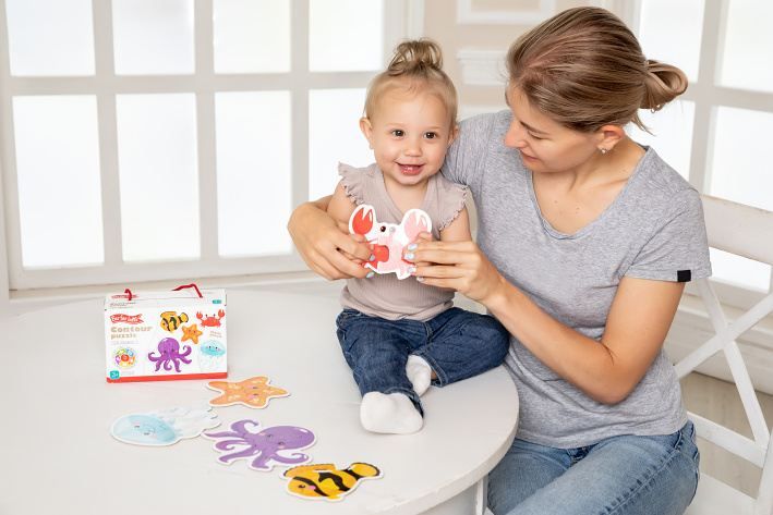 Puzzle obrysové pro děti, motiv mořská zvířátka. Balení obsahuje 5 puzzle obrázků, které se skládají ze 2 - 4 dílků.