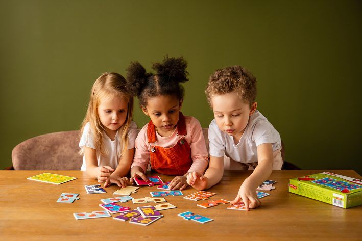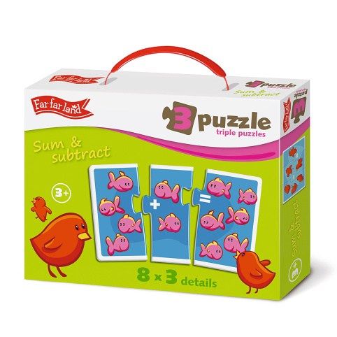 Far Far Land Puzzle počty. Balení obsahuje 8 puzzle obrázků s jednoduchými výpočty - sčítání a odčítaní do 10. Obrázky se skládají z trojic dílků.