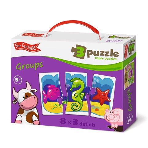 Far Far Land Puzzle trojice skupinky. Balení obsahuje 8 puzzle obrázků, které se skládají ze 3 dílků (vyobrazují trojice k sobě patřících předmětů nebo postaviček).