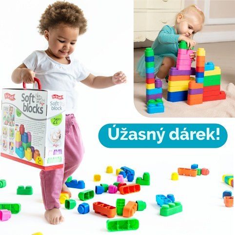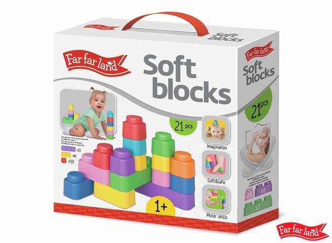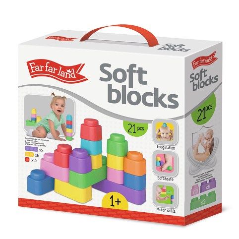 Far Far Land Stavebnice měkká. Balení obsahuje 21 měkkých bloků (5xtrojblok, 6xdvojblok, 10xjednoblok). Všechny bloky jsou vyrobeny z měkkého bezpečného materiálu.