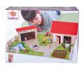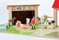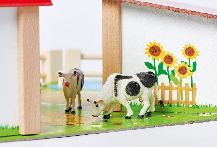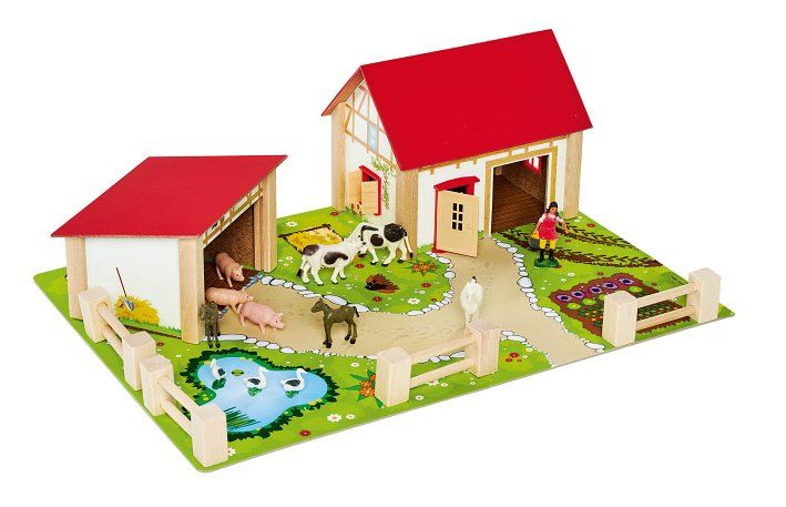 Dřevěná farma obsahuje 2 hospodářské budovy, figurky hospodáře a zvířátek, oplocení a základnu o rozměrech 36 x 51 cm. Celkem obsahuje 20 ks.