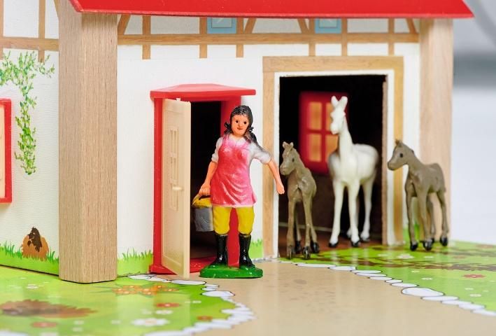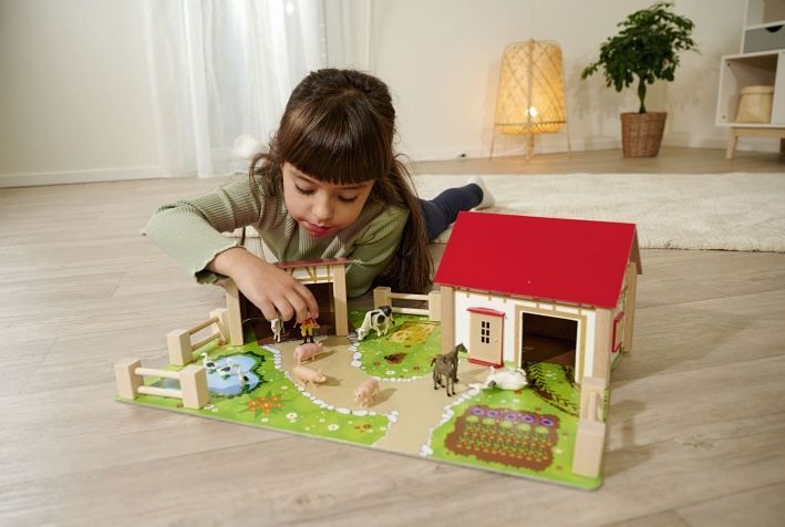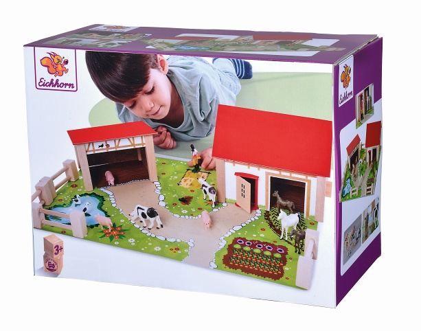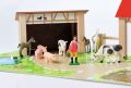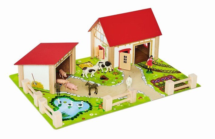 Dřevěná farma obsahuje 2 hospodářské budovy, figurky hospodáře a zvířátek, oplocení a základnu o rozměrech 36 x 51 cm. Celkem obsahuje 20 ks.