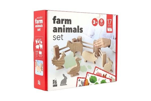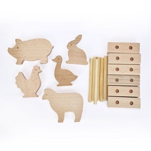 Kombinujte sadu farmářských zvířat a dřevěné stavebnice pro zábavnou hru! Postavte si z dílků dle vlastní fantazie farmu, rozestavte si zvířátka a nechte svou farmu prosperovat! V balení naleznete 17 kusů stavebnice, 5 naučných kartiček o zvířátkách a 5 zvířátek.
