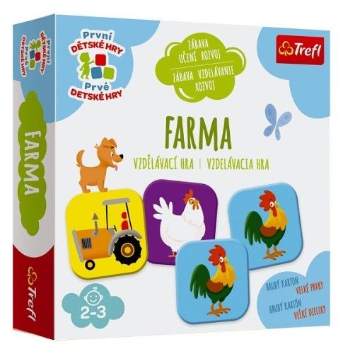 Hra na podporu paměti pro nejmladší hráče. Dítě se zábavnou formou naučí poznávat zvířata a předměty související se životem na farmě. Jednoduchá pravidla a pestrobarevné obrázky dítě podněcují ke hře, což je zároveň způsob učení. Sada her pro nejmladší hráče ve věku 2-3 let, kteří právě začínají objevovat svět kolem sebe. Jednotlivé hry pomáhají rozvíjet různé schopnosti malých hráčů a přitom plně uspokojují jejich přirozenou zvídavost. Obsahuje: 12 dvojic velkých kartiček na pexeso, návod.