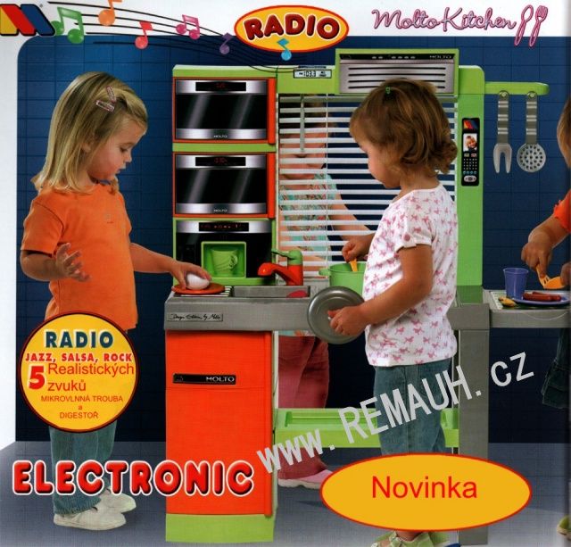 Elektronická kuchyň vyrobená z různobarevných plastových součástí. Obsahuje mikrovlnou troubu, odsávač par, rádio, žaluzii a 17 kusů kuchyňského nádobí.