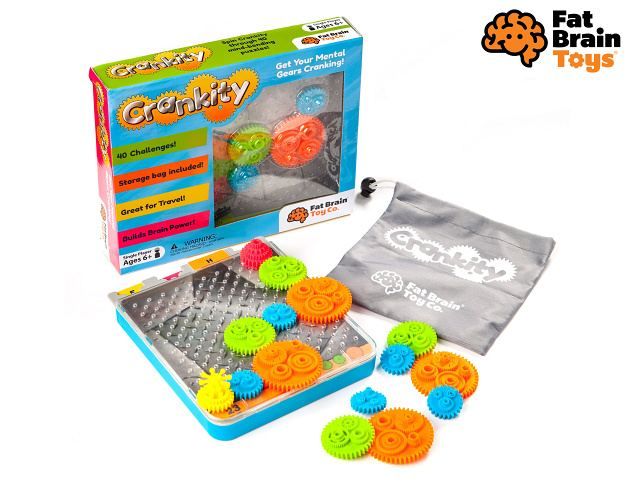 Hlavolam Crankity. Balení obsahuje 14 ozubených koleček, kliku, vkládací plochu a 40 karet s hlavolamy. Hlavolamy jsou rozděleny do 4 kategorií podle obtížnosti. Vyskládejte ozubená kolečka na vyznačená místa na kartě, doplňte vhodná kolečka na zbývající místa tak, aby byla všechna kolečka propojená. Zatočte klikou, všechna kolečka se musí točit.