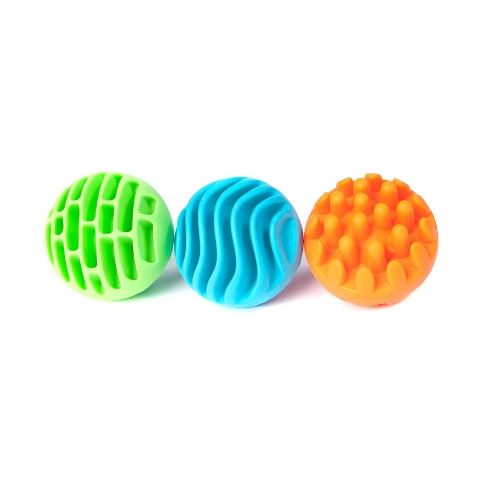 Fat Brain Hmatové míčky Sensory Rollers. Balení obsahuje 3 míčky. Každý z nich má unikátní tvar a texturu. Každý míček má 2 textury, celkem 6 textur. Míčky cinkají. Pro rozvoj hmatového vnímání dítěte. Nezávadné, vyrobeno s kvalitního silikonu, odolný a vhodný pro kousání.