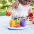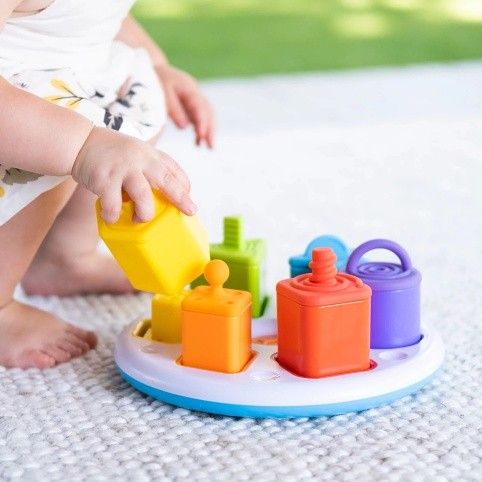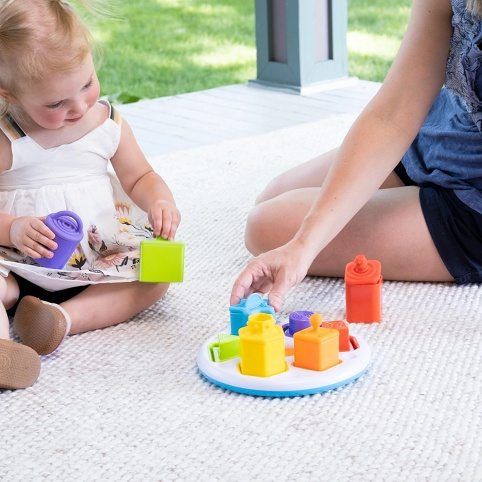 Fat Brain Měkká vkládačka Plugzy 23 cm. Obsah balení - Kruhový disk s 6 různými otvory. Do každého otvoru je vložena speciálně tvarovaná hračka, která se skládá ze 2 částí - pevné plastové tělo a měkké gumové víčko. Víčko i tělo hračky je možné nasadit na podstavec v různých kombinacích.