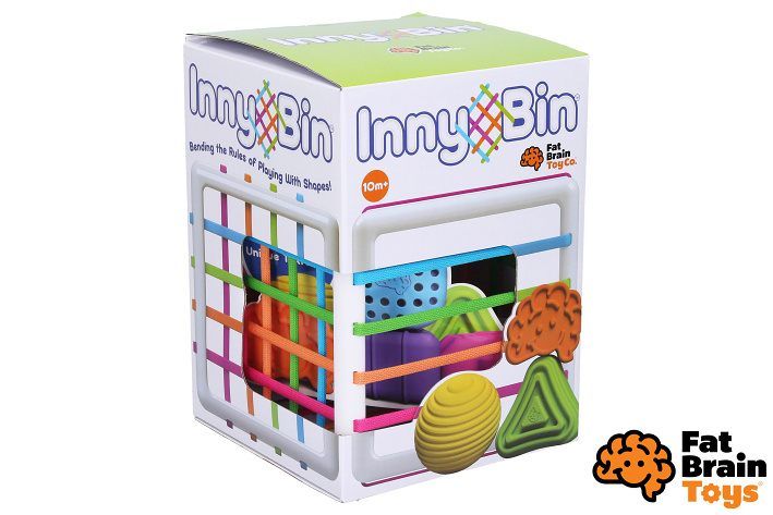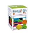 InnyBin mřížkovaná vkládačka. Rám kostky je z plastu. Mřížku tvoří elastické provázky. Různě tvarované kostky z měkkého materiálu lze jednoduše prostrkávat skrz mřížku.
