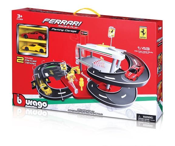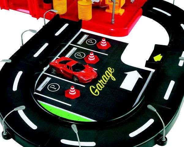 Třípatrová garáž Ferrari Kids s myčkou v sobě skrývá mnoho funkčních prvků! Vyvez autíčko výtahem až do nejvyššího patra garáže a spusť ho dolů po silnici! Natankuj, umyj auto v myččce a projeď zvedacími závorami!