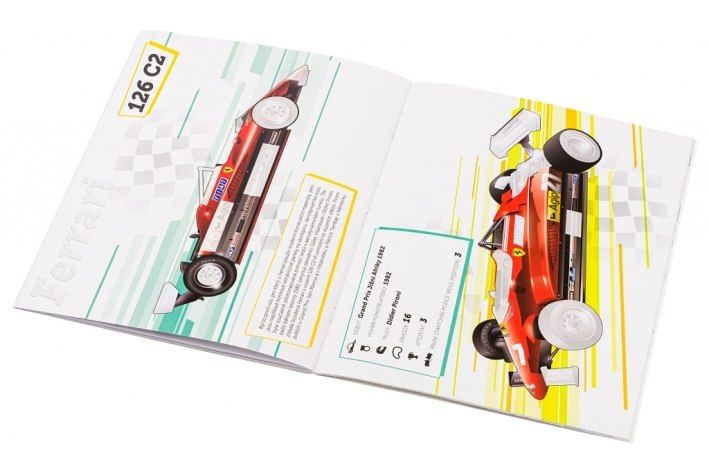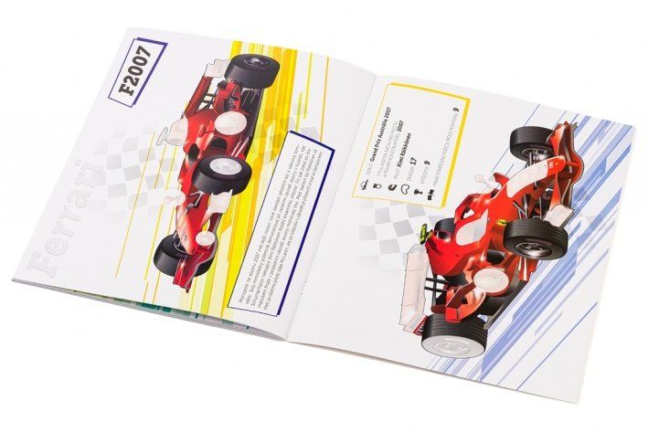 Objevte závratnou rychlost závodních vozů stáje Scuderia Ferrari a užijte si spoustu zábavy s doplňováním atraktivních modelů proslulé značky samolepkami. Kromě zábavy vás čeká i řada zajímavých informací o těchto úžasných nablýskaných strojích a jejich technických parametrech.
