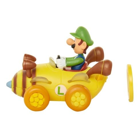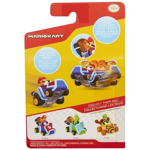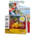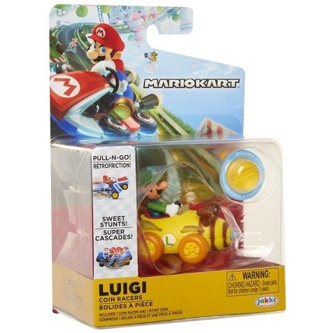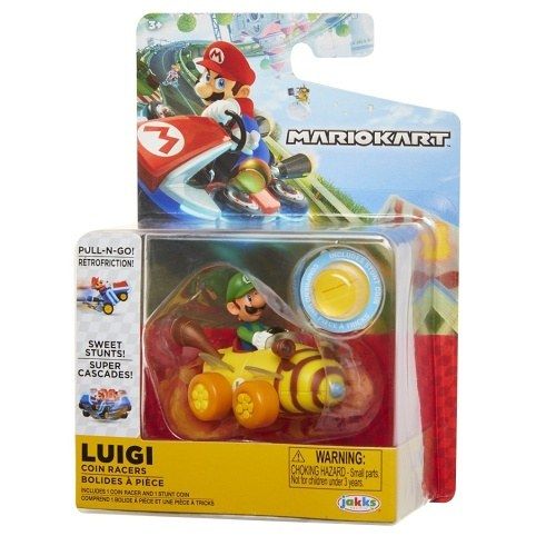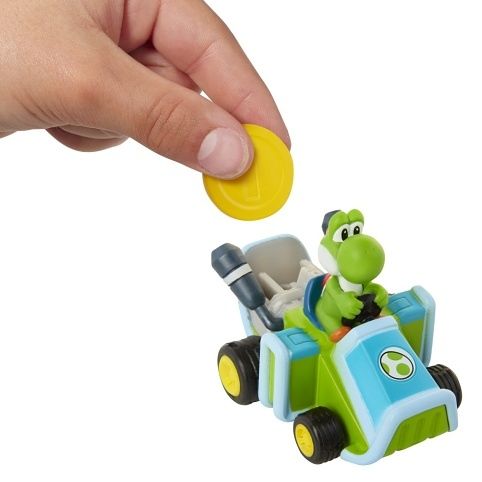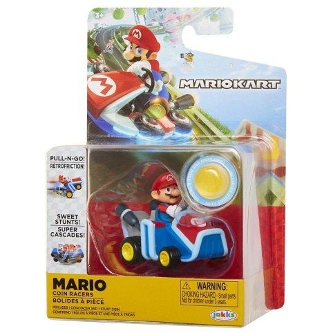 Figurka + motokára Super Mario na mince. Mario Coin Racers jsou zábavné 2palcové motokáry, které jsou dodávány se zlatým penízkem, umožňující motokárám pohyb kol o 360stupňů! Stačí vložit minci a sledovat, jak váš závodník jede!
